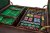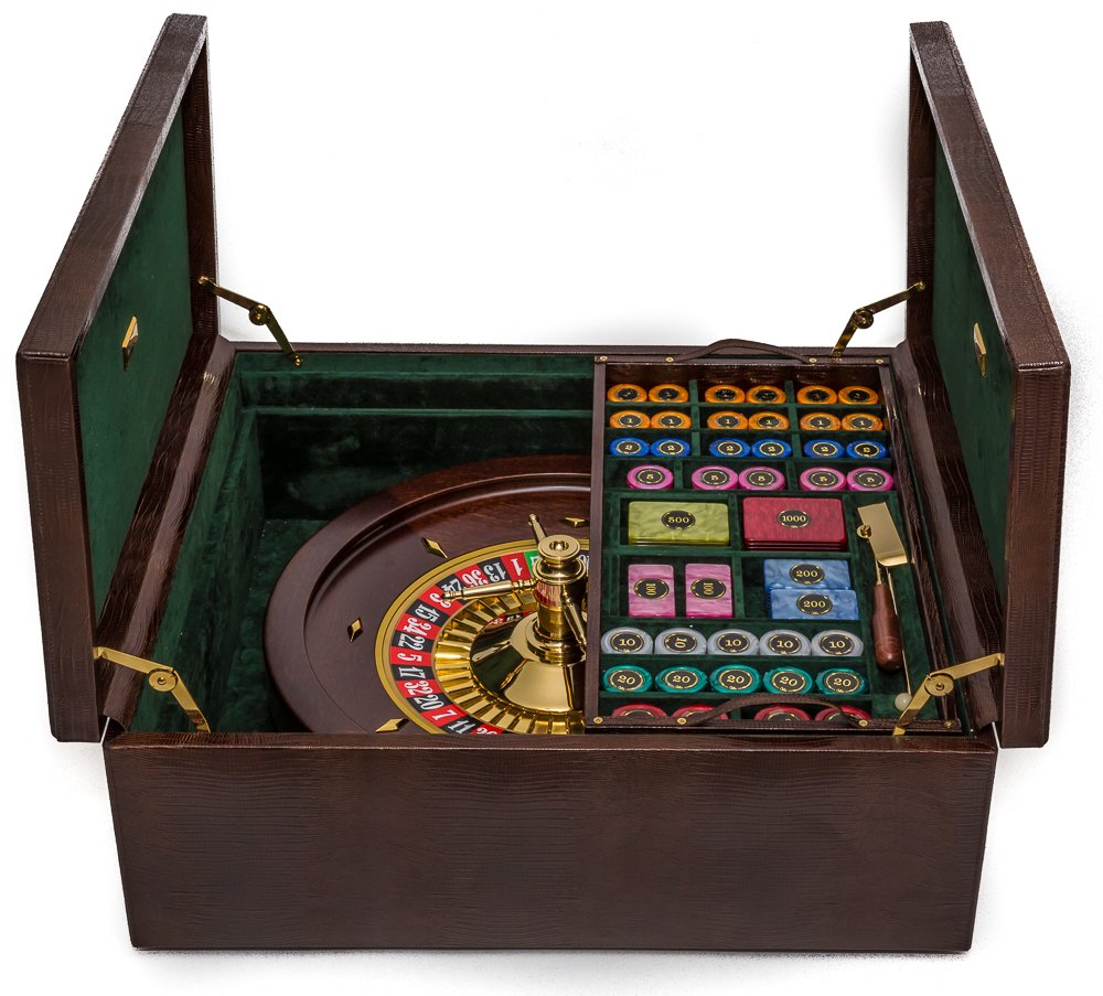 This luxury roulette set is hand crafted in Italy.  Made of solid mahogany with a 24kt gold plated wheel. The wheel is professionally balanced just like the ones in the casinos. It is complete with 215 mother of pearl type numbered chips in a removable tray.  The other tray holds the roulette cloth. Also complete with a rake for the chips which has a solid walnut handle the scoop and pole are plated with 24K gold plated. The case is made of genuine lizard & lined with a a rich hunter green pull suede, all hardware is also 24K gold plated. The case is extremely large in size, when opened there are two removable trays on the top with the poker chips and cloth and below is the massive roulette wheel.  This luxury roulette set truly exemplifies luxury at its very best, this is definitely a set to impress, even if you don't play this is a fine piece of furniture to leave on display in a study or living room. This is an unforgettable gift that will be appreciated from one generation to the next. This luxury roulette set is made in Italy for you! When not in use it can also be used as a coffee table since it is so large.