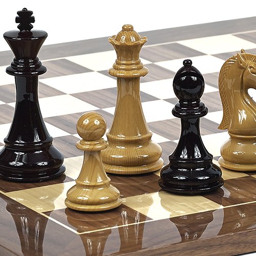 Brown and tan acrylic chessmen with a high gloss finish. This set has a beautiful finish with imitation wooden grains. Pieces are very heavily weighted with leatherette bottoms. This is a beautiful Staunton chessmen set for the serious player. Imported from the Orient.