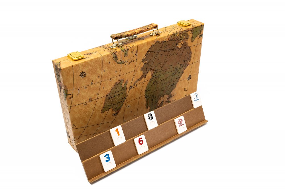 Deluxe leatherette map of the world case with solid brass latches. Complete with 106 engraved/painted uria stone tiles (same component bowling balls are made of so they will not crack, chip or fade) which include two jokers, 1 die, 4 wood racks and instruction booklet. Imported from the Orient.