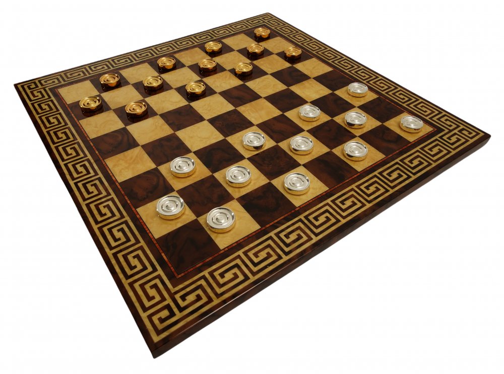 This beautiful checkers set truly exemplifies luxury at its very best. Solid brass checkers plated with 24K Gold/Silver from Italy. The checkers board is made of maple, walnut, briar and root wood from Italy with a gorgeous inlaid design around the board by master Italian artisans with a high gloss finish. This is a beautiful board to be left out on display.