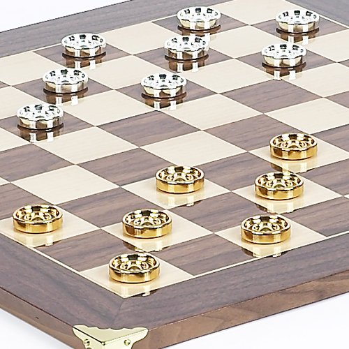 This beautiful checkers set truly exemplifies luxury at its very best. Solid brass checkers plated with 24K Gold/Silver from Italy. The checkers board is made of maple/walnut from Spain with a high gloss finish and brass corners. This is a beautiful board to be left out on display.