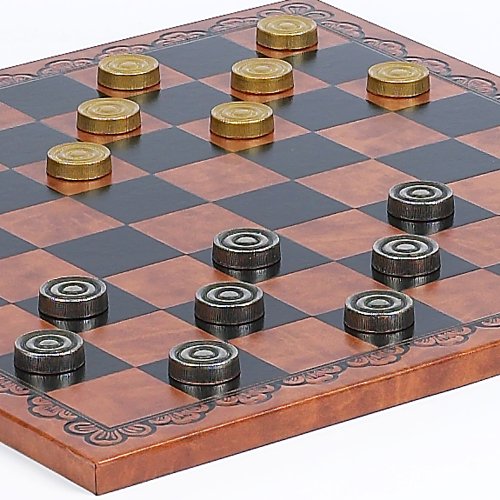 Metal checkers brass/silver plated with a tooled leatherette board from Italy.
